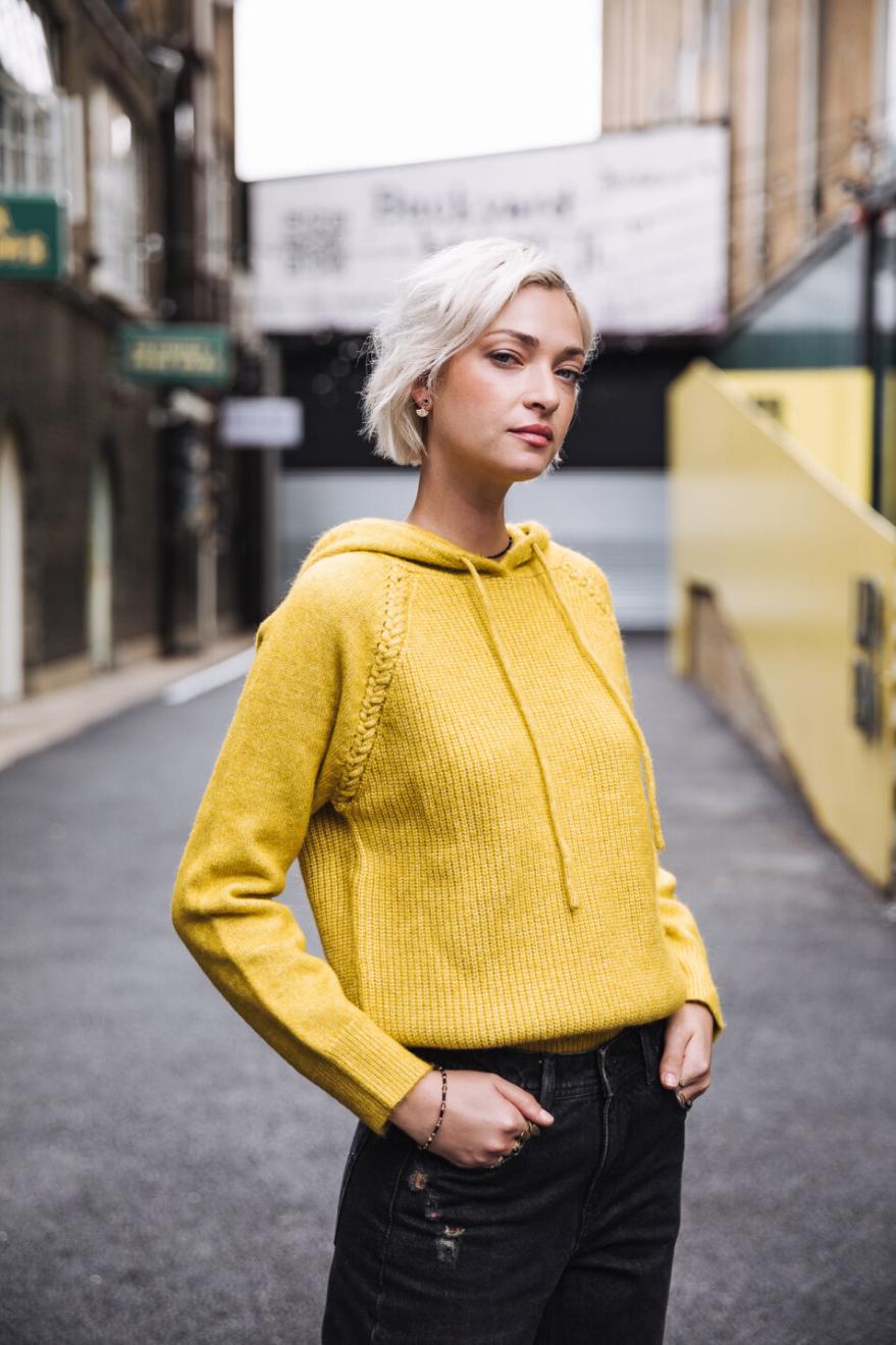 أسلوب مريح: لا شيء يضاهي قطعة محبوكة رائعة تُبقيكِ دافئة! مع موديل بيرس، تجمع الملابس المحبوكة بين راحة السترة ذات القلنسوة بقلنسوتها وأربطة طويلة من الأمام. تفاصيلها المضفرة على كلا الجانبين ولونها الأصفر الخردلي الخفيف تُضفي لمسةً أنيقة على التنورة المنسدلة أو الجينز أو البنطلون المطبوع.