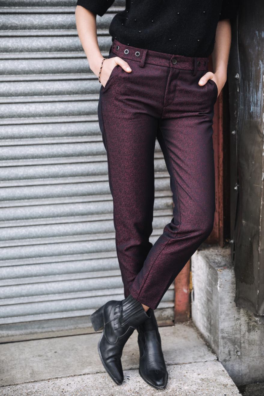 أجواء مظلمة! في كل موسم، نعشق ارتداء بنطال كلوديا بأقمشة منقوشة جميلة. في نسخة "مظلمة"، يُزيّن قماشه بنقشة سوداء على خلفية من درجات اللون الأسود العنابي. عصري للغاية.