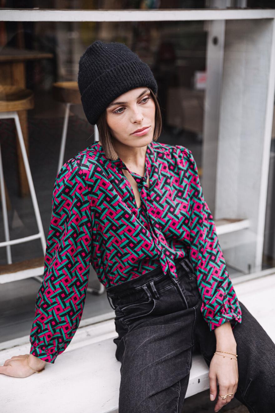 شريكة في الجريمة: بلوزة بايا كروز هي البلوزة الأكثر أناقة في خزانة ملابسك! ياقتها المزينة بفيونكة تجعلها أنيقة، وقصتها المستقيمة وخفتها ستجعلانكِ تختارينها شريكة لمغامراتكِ اليومية، ونقشها الهندسي بدرجات الوردي مع لمسات من الأخضر يضفي لمسةً حيويةً على ملابسكِ ;)