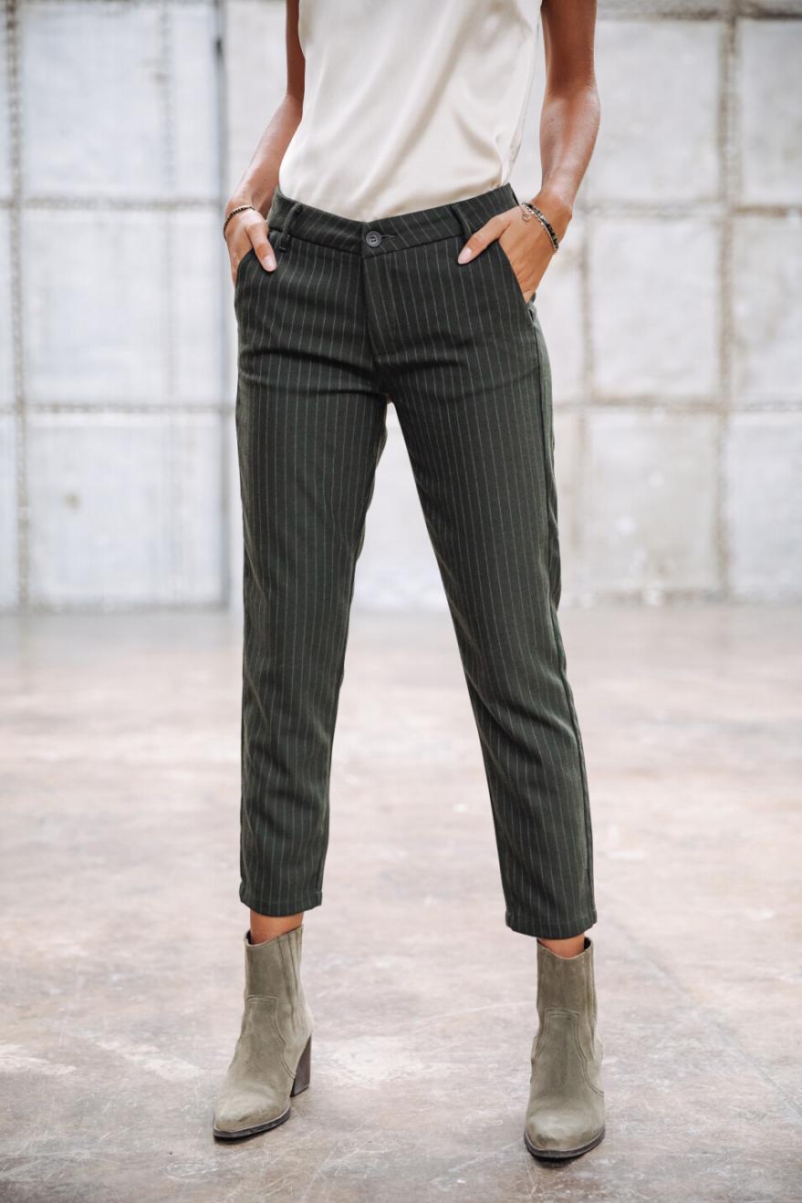 ALKOHOL LESNÍ NOCI! Každou sezónu rádi nosíme naše kalhoty Claudia z krásných texturovaných vzorovaných materiálů. Ve verzi Buren Khaki je látka zdobena jemnými svislými pruhy na khaki pozadí. Megatrendy.