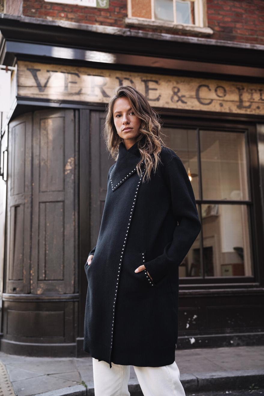 ROCK'N'ROLLOVÉ MIMINKO: Claudie je rock'n'rollový a zároveň pohodlný kardigan, se kterým se nebudete chtít rozloučit. Dlouhý, asymetrický černý úplet s cvočky podél límce a zapínání. Je to přesně ten typ kousku, který si můžete obléknout i ve spěchu a přitom stále vypadat stylově a skvěle!