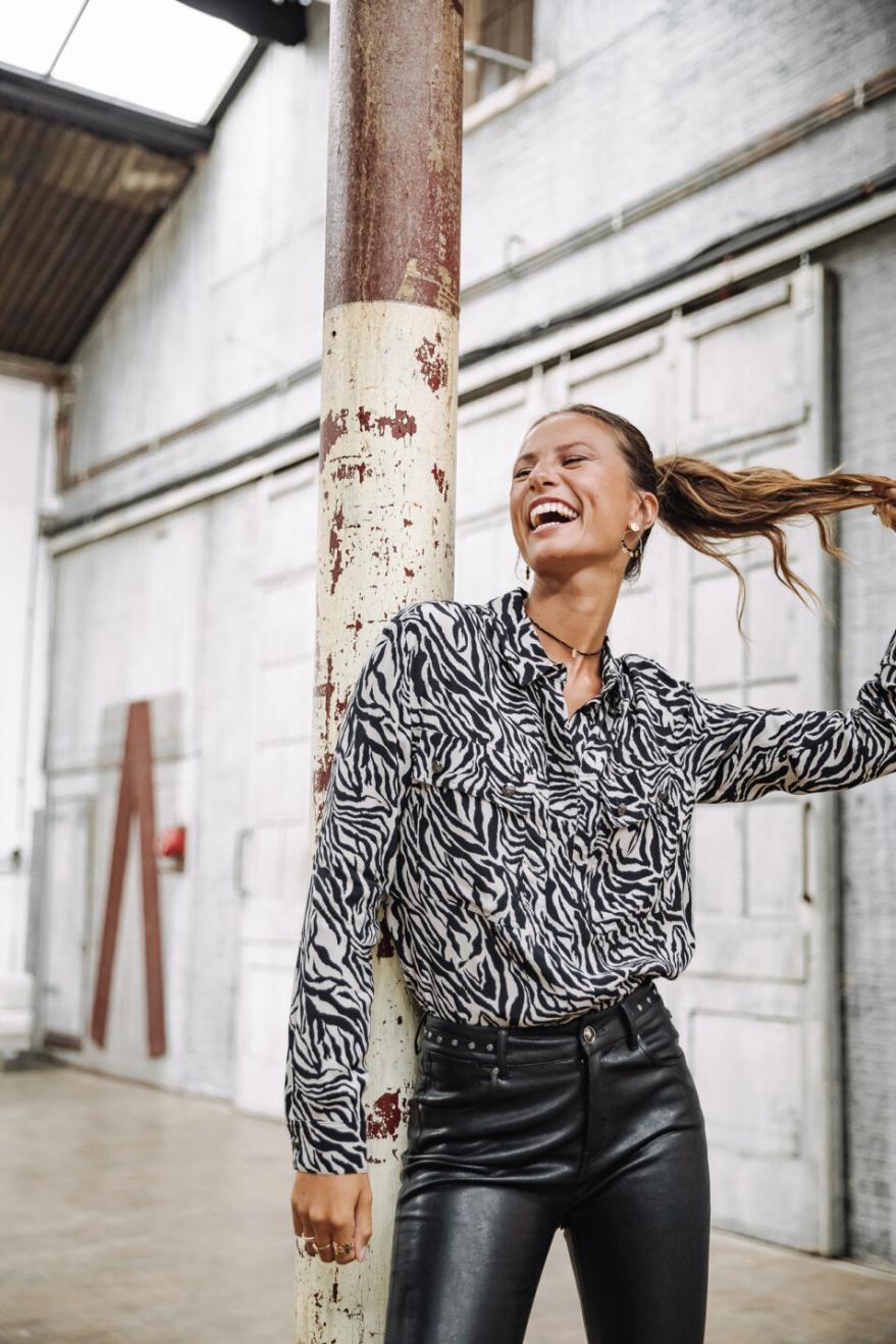 ZEBROVÝ VZOR: Pojďme se pustit do černobílého vzhledu s nejikoničtějšími zvířecími vzory. Díky dvěma stylovým kapsám vpředu a splývavému materiálu je to nejoblíbenější košile každé šéfky!