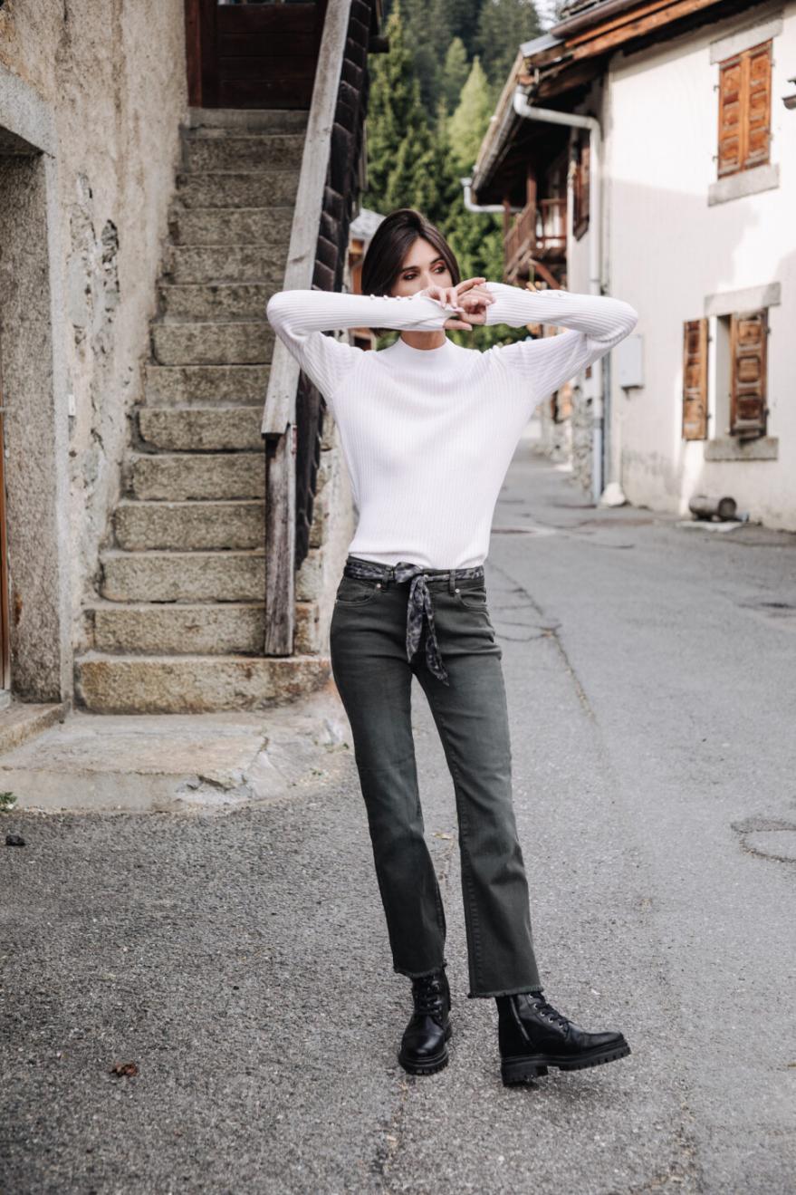 RETRO NÁDHERY: Přiléhavé kalhoty Norma s rozšířeným střihem do stran jsou přesně podle trendu! Jejich retro vzhled je doplněn ženštějším potiskem v pase a šátkem. Ve spodní části nohavic jsou zakončeny surovým lemem. Nakonec jsme je ušili z pohodlného strečového kepru s pěkně vybledlou khaki barvou.