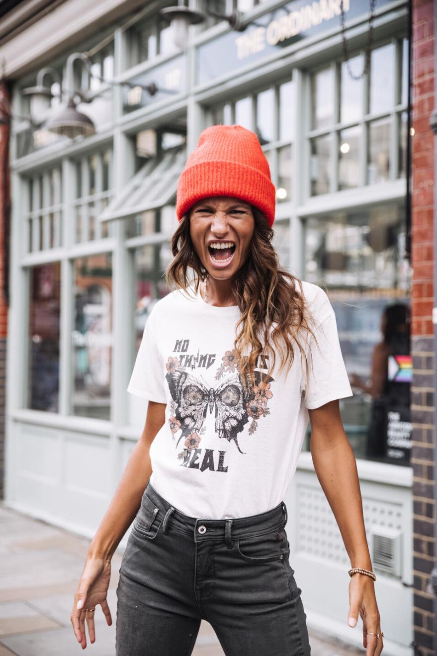 VINTAGE TRIČKO: Ve Freemanu máme velkou oblíbená vintage trička. Výsledkem je tričko Suria Butterfly: ležérně spuštěná ramena, retro rockový potisk a bílá látka vyrobená převážně z bavlny. Vítězný recept!