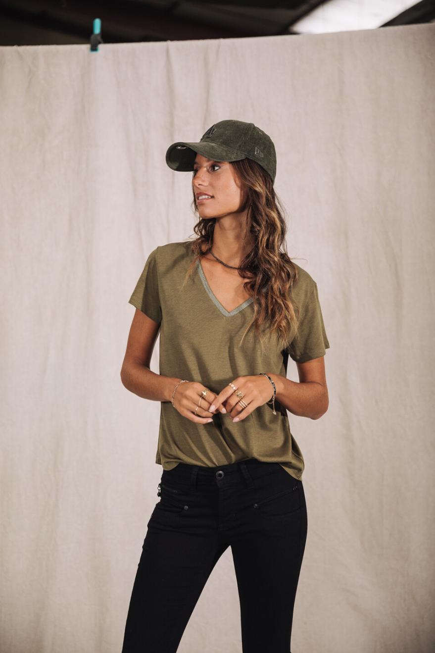 DUSTY OLIVE: Ve Freemanu víme, jak lichotivě ženské postavě sluší výstřih do V. Proto jsme vytvořili Tora, tričko ze 100% bavlny s třpytivým límečkem a krásnou olivově khaki barvou.